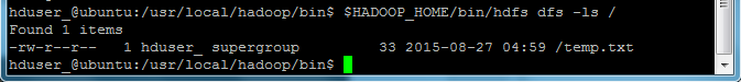 hduser_@ubuntu:~$ $HADOOP_HOME/bin/hdfs dfs -copyFromLocal temp.txt /