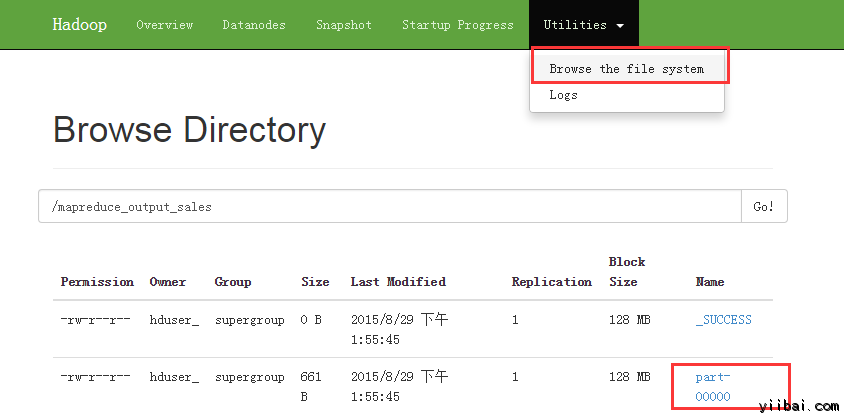 現(xiàn)在選擇 'Browse the filesystem' 并導(dǎo)航到 /mapreduce_output_sales 如下: