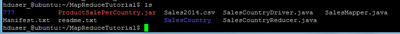 hduser_@ubuntu:~/MapReduceTutorial$ $JAVA_HOME/bin/jar cfm ProductSalePerCountry.jar Manifest.txt SalesCountry/*.class