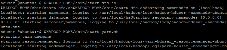 hduser_@ubuntu:~$ $HADOOP_HOME/sbin/start-dfs.sh hduser_@ubuntu:~$ $HADOOP_HOME/sbin/start-yarn.sh