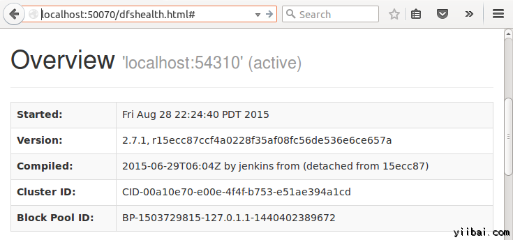 結(jié)果也可以通過(guò) Web 界面看到,打開(kāi) Web 瀏覽器,輸入網(wǎng)址:http://localhost:50070/dfshealth.jsp ,結(jié)果如下: