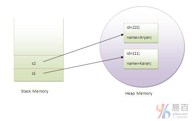 從上圖可以看出,對象在堆內(nèi)存區(qū)域獲取內(nèi)存。 引用變量指的是在堆內(nèi)存區(qū)域中分配的對象。 這里,s1和s2都是引用存儲器中分配的對象的引用變量。