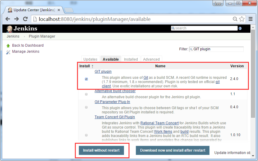 該列表將被過濾。找到 “GIT plugin”選項(xiàng),并單擊按鈕 ‘Install without restart’,開始下載安裝。