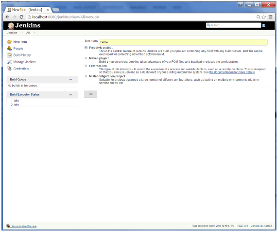 Jenkins 重新啟動(dòng)后,Git會(huì)可作為配置的同時(shí)也可以作業(yè)的選項(xiàng)。 要驗(yàn)證,單擊新建項(xiàng)目在 Jenkins 的菜單選項(xiàng)。然后輸入一個(gè)名稱的工作,在以下示例中,輸入的名稱是“Demo”。選擇“Freestyle project”作為項(xiàng)目類型。單擊確定按鈕。
