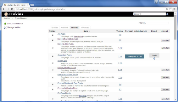 要卸載插件,轉到Manage Jenkins → Manage plugins。點擊安裝標簽。有些插件有卸載選項。您可以點擊這些按鈕來卸載插件。卸載后重新啟動 Jenkins 實例。