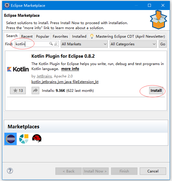 建議從Eclipse Marketplace安裝Kotlin插件。打開Eclipse,使用Help -> Eclipse Marketplace… 菜單,并搜索Kotlin插件: