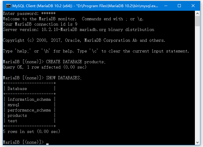 創(chuàng)建一個(gè)名稱為"products"的數(shù)據(jù)庫。