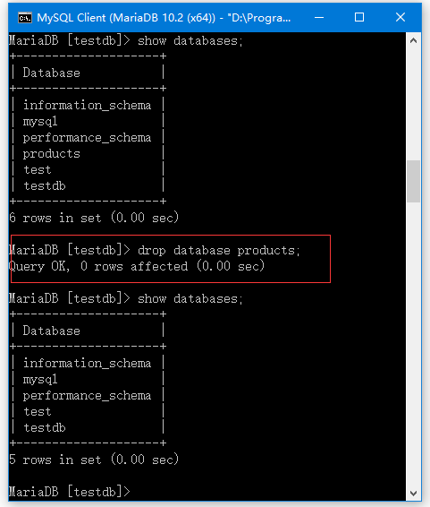 在執(zhí)行上面語句后,數(shù)據(jù)庫"products"現(xiàn)在被刪除??梢允褂?code>SHOW DATABASES命令來驗證它。