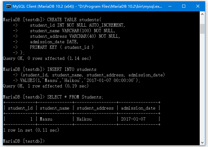 VALUES(1,'Maxsu','Haikou','2017-01-07 00:00:00');