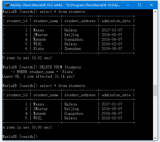 MariaDB [testdb]> select * from students;
