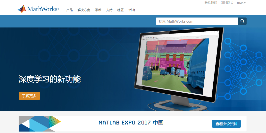 Matlab官方網(wǎng)站是:https://www.mathworks.com/ , 打開后如下所示 -