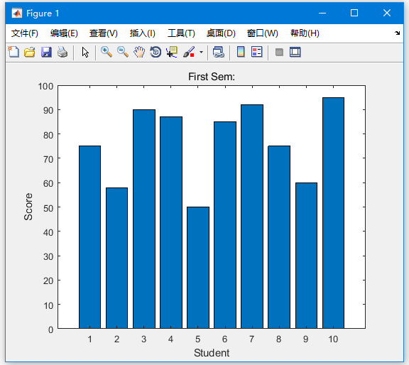 假設(shè)有10名學(xué)生,這些學(xué)生某次考試獲得分?jǐn)?shù)是:75,58,90,87,50,85,92,75,60和95,使用這此分?jǐn)?shù)來(lái)繪制條形圖如下。