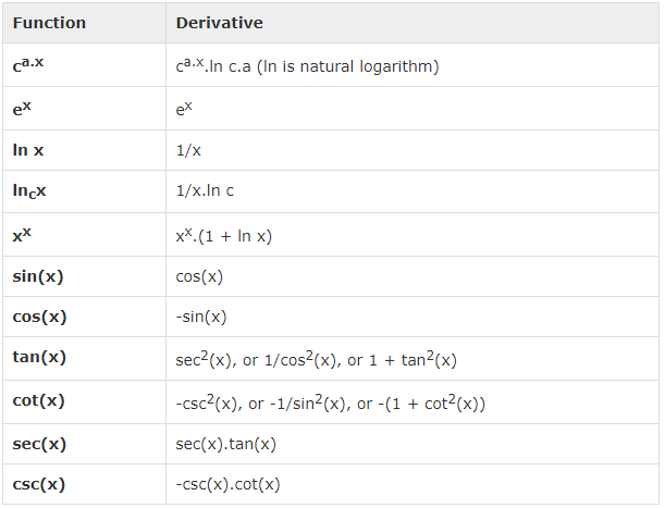 下表提供了常用指數(shù),對數(shù)和三角函數(shù)的導數(shù),