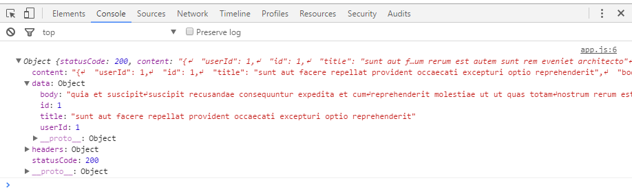 這是可以使用GET,POST,PUT和DELETE方法參數(shù)。在這個(gè)例子中,我們將向你展示如何使用GET參數(shù)。這一章中的例子將使用偽造REST API:訪問這個(gè)網(wǎng)站. 可以看到,這個(gè)方法是使用四個(gè)參數(shù)。我們已經(jīng)提到第一個(gè)參數(shù)GET。第二個(gè)是:API URL. 第三個(gè)參數(shù)是一個(gè)空的對(duì)象,在這里我們可以設(shè)置一些可選參數(shù)。最后一個(gè)方法是異步回調(diào),我們可以處理錯(cuò)誤,并響應(yīng)工作。