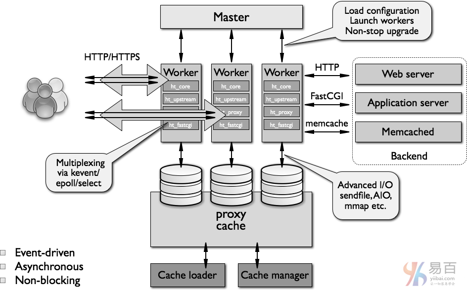 從一開始nginx就是一個專門的工具,可以實現(xiàn)更高性能,更密集和經(jīng)濟(jì)地使用服務(wù)器資源,同時實現(xiàn)網(wǎng)站的動態(tài)發(fā)展,所以它采用了不同的模式。 它實際上受到各種操作系統(tǒng)中高級事件機(jī)制的不斷發(fā)展的啟發(fā)。發(fā)展結(jié)果變成是一個模塊化的,事件驅(qū)動的,異步的,單線程的非阻塞架構(gòu)的nginx代碼基礎(chǔ)。