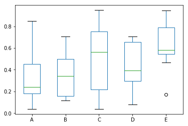 例如,這里是一個箱形圖,表示對[0,1)上的統(tǒng)一隨機變量的10次觀察的五次試驗。