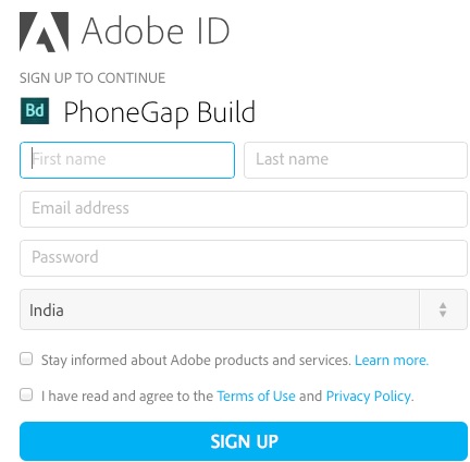 轉(zhuǎn)到www.build.phonegap.com并點(diǎn)擊注冊(cè),一個(gè)新的窗口將打開(kāi)的顯示如下: