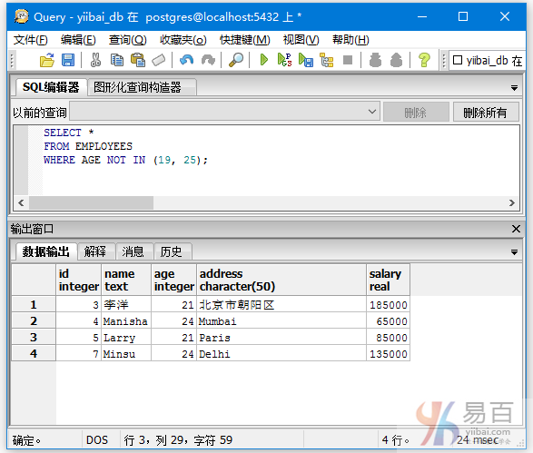 查詢那些年齡不是19,25的數(shù)據(jù),執(zhí)行以下查詢: