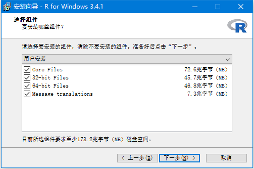 因為它是Windows安裝程序(.exe),下載的名稱為“R-3.4.1-win.exe”。只需雙擊并運行接受默認設置的安裝程序即可。 如果您的Windows是32位版本,它將安裝32位版本。但如果您的Windows是64位,那么它將安裝32位和64位版本。