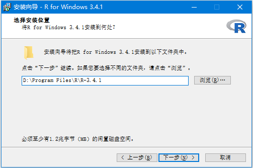 第二步: 選擇安裝目錄,這里安裝目錄為:D:\Program Files\R\R-3.4.1,如下所示 -