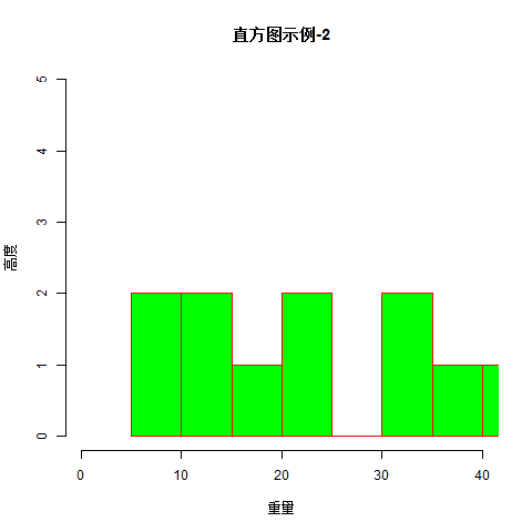 hist(v, main="直方圖示例-2", xlab = "重量", ylab="高度",col = "green",border = "red", xlim = c(0,40), ylim = c(0,5),