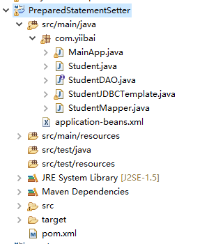 StudentJDBCTemplate對象從數(shù)據(jù)庫中讀取Student對象。PreparedStatementSetter對象在查詢中設(shè)置參數(shù)。StudentMapper是一個(gè)RowMapper對象,用于將每個(gè)獲取的記錄映射到學(xué)生對象。要了解上述與Spring JDBC相關(guān)的概念,下面我們編寫一個(gè)select查詢語句的示例。打開Eclipse IDE,并按照以下步驟創(chuàng)建一個(gè)Spring應(yīng)用程序,這里創(chuàng)建一個(gè)名稱為:PreparedStatementSetter 的項(xiàng)目。