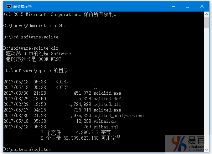 首先打開(kāi)命令提示符并進(jìn)入創(chuàng)建數(shù)據(jù)庫(kù)的目錄。之后,可以使用“dir”命令查看sqlite目錄。