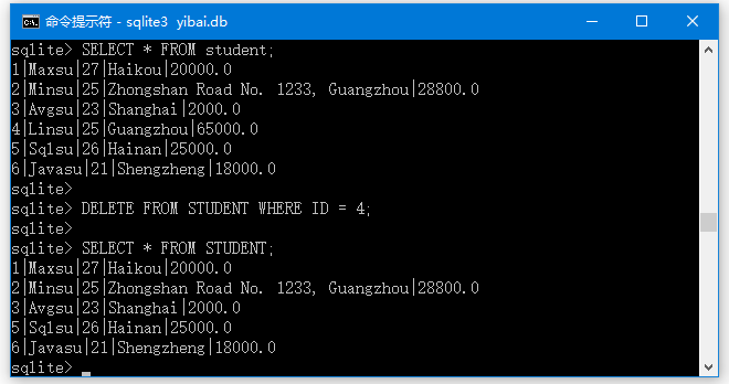 在執(zhí)行上面語句后,學(xué)生ID為4的記錄將被刪除; 可以使用SELECT語句檢查它:
