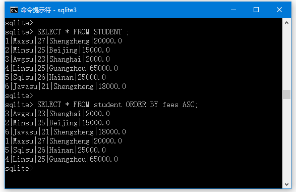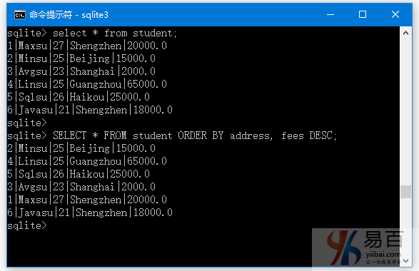 從student表獲取所有數(shù)據(jù),并按ADDRESS和FEES對結(jié)果進(jìn)行降序排序: