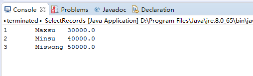 要使用Java程序從表中選擇/查詢記錄,請(qǐng)使用以下代碼。 創(chuàng)建一個(gè)新的Java類 - SelectRecords.java,使用以下代碼 -
