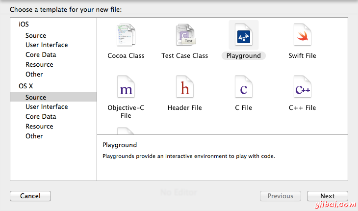 啟動(dòng) Xcode 6, 并轉(zhuǎn)到 File\New\File. 選擇 iOS\Source\Playground, 并點(diǎn)擊 Next.