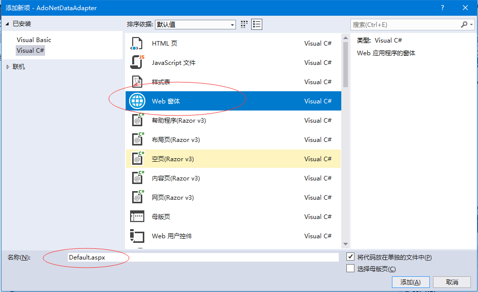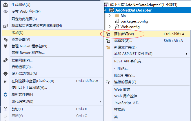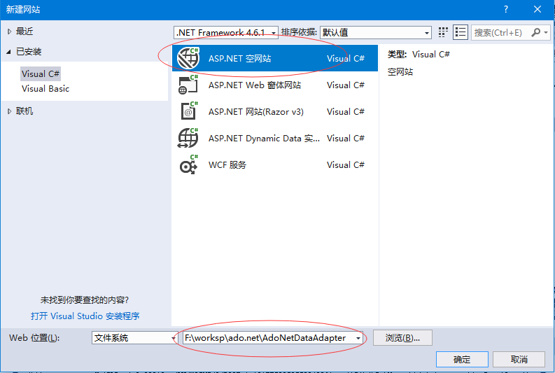 打開 Visual Studio 創(chuàng)建一個網(wǎng)站項目,一個ASP.NET空的網(wǎng)站:AdoNetDataAdapter,如下所示 -