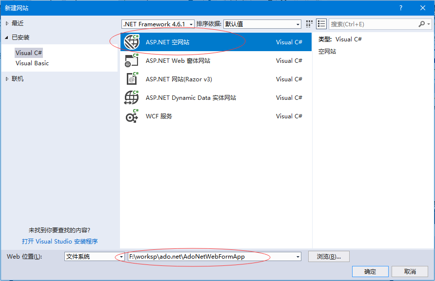 首先打開(kāi)Visual Studio創(chuàng)建一個(gè)名稱為:AdoNetWebFormApp,如下所示 -