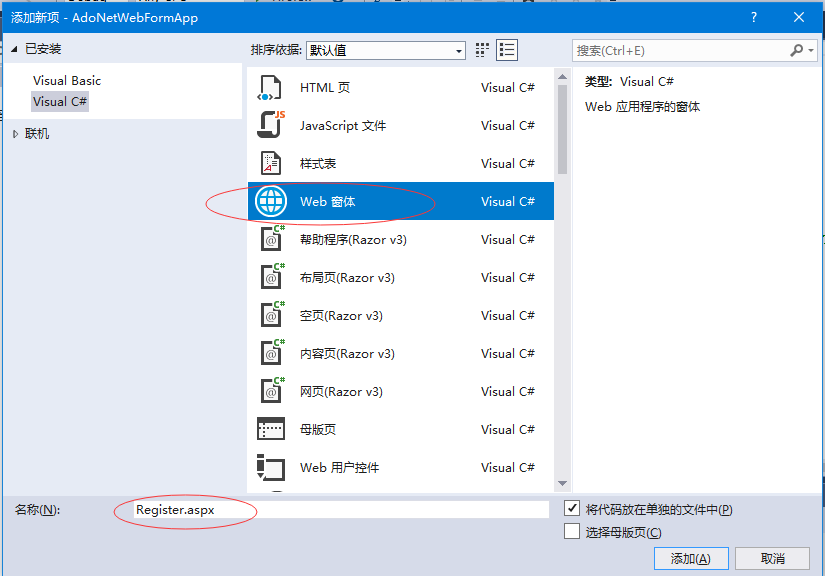 在這個(gè)項(xiàng)目中,在這個(gè)項(xiàng)目中添加一個(gè)新建項(xiàng),在項(xiàng)目名稱上點(diǎn)擊右鍵,在彈出的菜單中選擇:添加->添加新項(xiàng),文件的名稱為:Register.aspx,如下圖所示 -