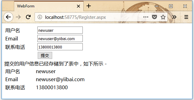 Label1.Text = "提交的用戶信息已經(jīng)存儲(chǔ)到了表中,如下所示 - ";