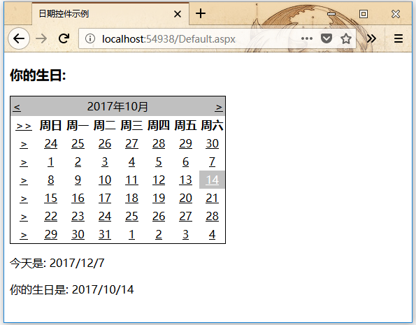 lblbday.Text = Calendar1.SelectedDate.ToShortDateString();