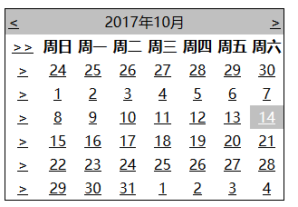 當選擇模式設(shè)置為值DayWeekMonth時,會出現(xiàn)一個帶有>符號的額外列,用于選擇星期,而一個>>符號出現(xiàn)在日期名稱左邊,用來選擇月份。