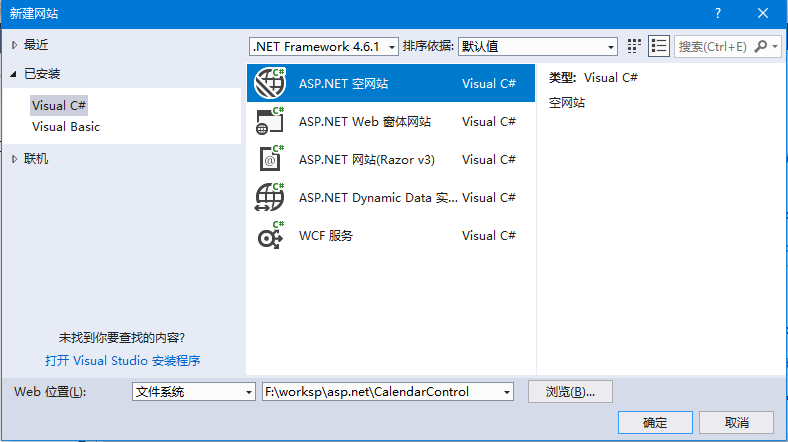 首先打開Visual Studio,創(chuàng)建一個名稱為:CalendarControl 的空ASP.NET網(wǎng)站項目,如下所示 -