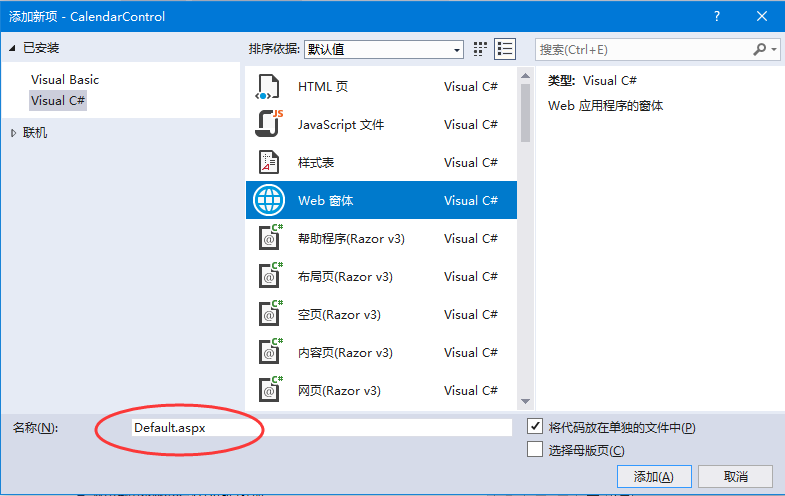 在這個項目名稱上點擊右鍵,在彈出的選項中選擇:添加 -> 添加新項,選擇Web窗體,創(chuàng)建一個文件:Default.aspx, 如下所示 -