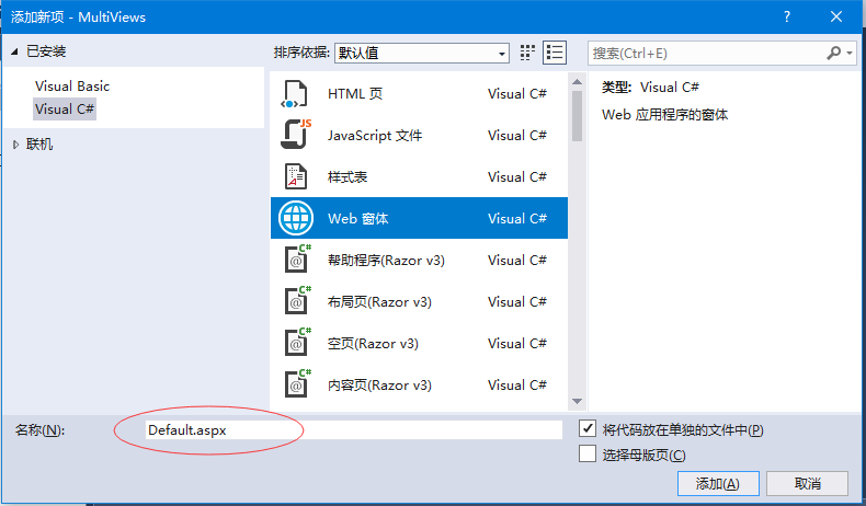 在這個(gè)項(xiàng)目名稱上點(diǎn)擊右鍵,在彈出的選項(xiàng)中選擇:添加 -> 添加新項(xiàng),選擇Web窗體,創(chuàng)建一個(gè)文件:Default.aspx, 如下所示 -