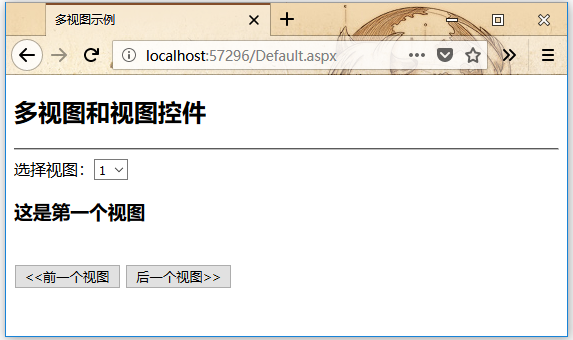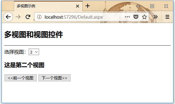 MultiView.ActiveViewIndex確定將顯示哪個(gè)視圖。這是在頁面上呈現(xiàn)的唯一視圖。 當(dāng)沒有顯示視圖時(shí),ActiveViewIndex的默認(rèn)值是-1。由于ActiveViewIndex在本例中定義為2,所以在執(zhí)行時(shí)會(huì)顯示第三個(gè)視圖。