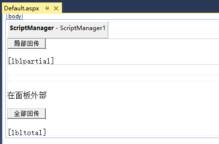 在應用程序中添加一個AJAX Web表單。 它包含默認的腳本管理器(ScriptManager)控件,插入更新面板。 在更新面板控件內(nèi)放置一個按鈕控件和一個標簽控件。 在面板外面放置另一組按鈕和標簽。