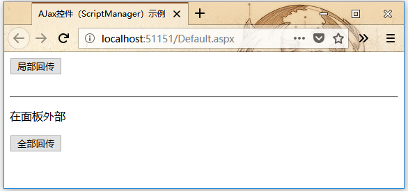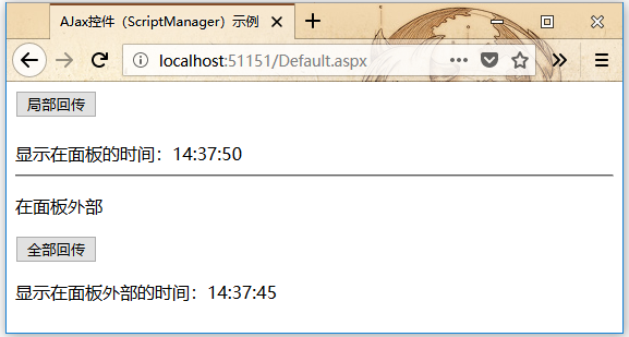 請注意,執(zhí)行該頁面時,如果點擊全部回傳按鈕,則會更新兩個標簽中的時間,但如果單擊局部回傳按鈕,則只會更新更新面板中的標簽。