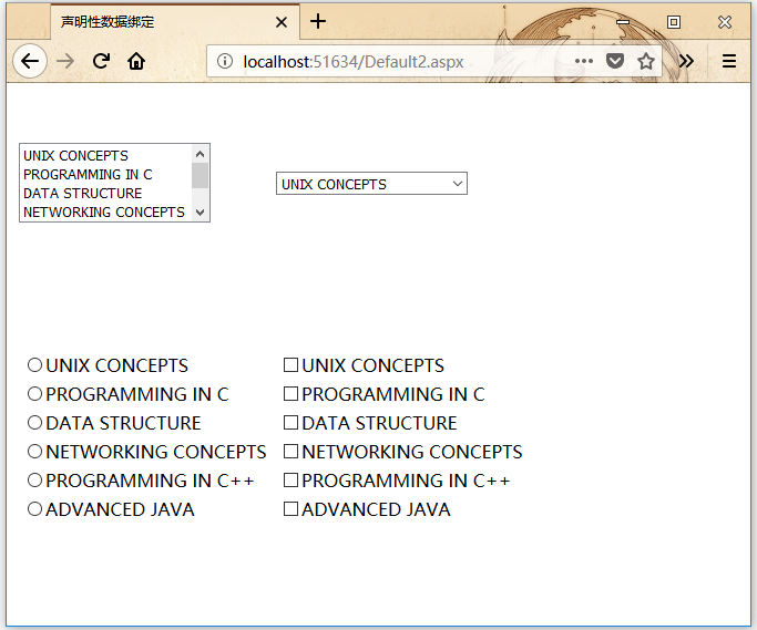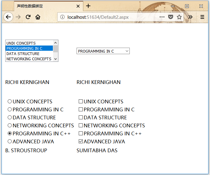 booklist類有兩個屬性:bookname和authorname。createbooklist方法是用戶定義的方法,它創(chuàng)建一個名為allbooks包含booklist對象數(shù)組。Page_Load事件處理程序確保創(chuàng)建booklist。該列表是IList類型,它實現(xiàn)了IEnumerable接口,并且能夠綁定到List控件。頁面加載事件處理程序?qū)?code>IList對象“bklist”與List控件的綁定。bookname屬性將被顯示,并且authorname屬性被視為值。List控件顯示,而相應的標簽顯示作者姓名,該名稱是List控件的所選索引的對應值。運行上面項目,得到以下結(jié)果 -