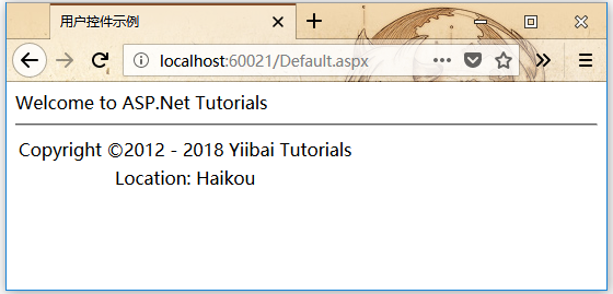 要將用戶控件添加到網(wǎng)頁,要將Register指令和用戶控件的一個(gè)實(shí)例添加到頁面。Default.aspx文件中的代碼如下: