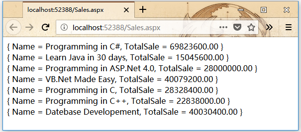 這些子句允許對查詢結(jié)果進行排序。要按照價格查詢書籍的標題,頁數(shù)和價格,請在Page_Load事件處理程序中編寫以下代碼: