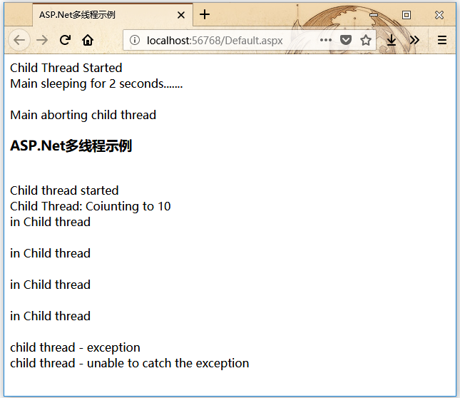 childthreadcall()方法來啟動一個新線程。主線程活動直接顯示在網(wǎng)頁上。2000毫秒,在此期間子線程執(zhí)行。ThreadAbortException異常并終止。運(yùn)行項(xiàng)目程序后,得到以下結(jié)果 -