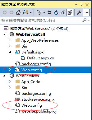 在這個應用程序中,有兩個web.config文件用于兩個項目,即Web服務和調用Web服務的Web站點。