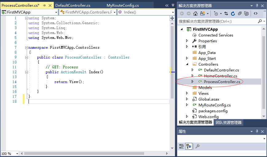 現(xiàn)在,將在Controllers文件夾中看到一個新的 C# 文件:ProcessController.cs,在Visual Studio中打開并進行編輯。如下圖所示 -