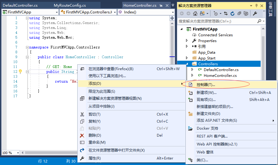 第2步 - 通過右鍵單擊解決方案管理器 中的Controllers 文件夾來創(chuàng)建ProcessController,然后選擇:添加 -> 控制器 。